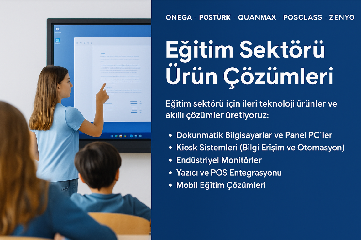 Eğitim sektörü, dijital dönüşümle birlikte daha interaktif, hızlı ve erişilebilir hale gelmiştir. Bu dönüşümde en büyük katkıyı sağlayan unsurların başında dokunmatik bilgisayarlar, panel PC çözümleri, kiosk sistemleri ve endüstriyel monitörler gibi ileri teknoloji ürünler yer almaktadır. Onega, Posclass, Postürk ve Quanmax markalarımızla eğitimin her aşamasında kullanılabilecek akıllı çözümler üretmekteyiz.